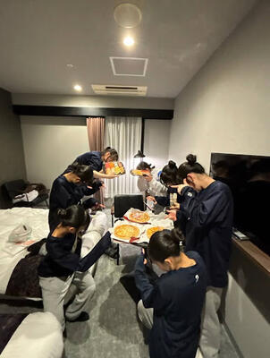 1日目の夜ごはんはホテルでUber Eatsを頼み、ひとつの部屋にみんなで集まって食べ、とても楽しかったです!2日目は試合後に市電に乗ってラッキーピエロを食べ、駅でお土産も買うことができました。自分たちの成長も感じられて、とても楽しい遠征でした!